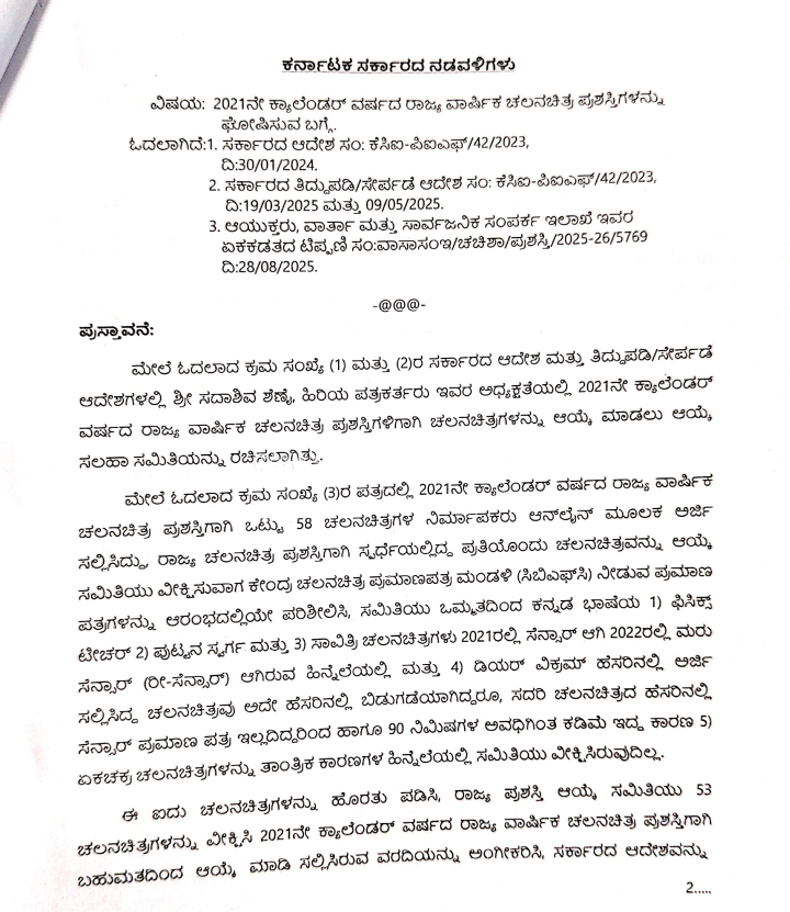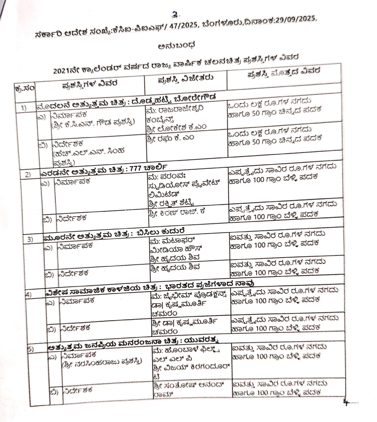 2021ನೇ ಸಾಲಿನ ರಾಜ್ಯ ಚಲನಚಿತ್ರ ಪ್ರಶಸ್ತಿ ಪ್ರಕಟಗೊಂಡಿದೆ. ಕೆ,ಎಂ ರಘು ನಿರ್ದೇಶನದ “ದೊಡ್ಡಟ್ಟಿ ಬೋರೇಗೌಡ” ಚಿತ್ರ ಅತ್ಯುತ್ತಮ ಚಿತ್ರ ಪ್ರಶಸ್ತಿಗೆ ಭಾಜನವಾಗಿದೆ.