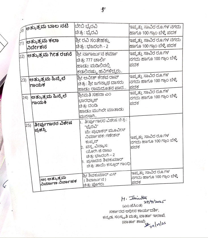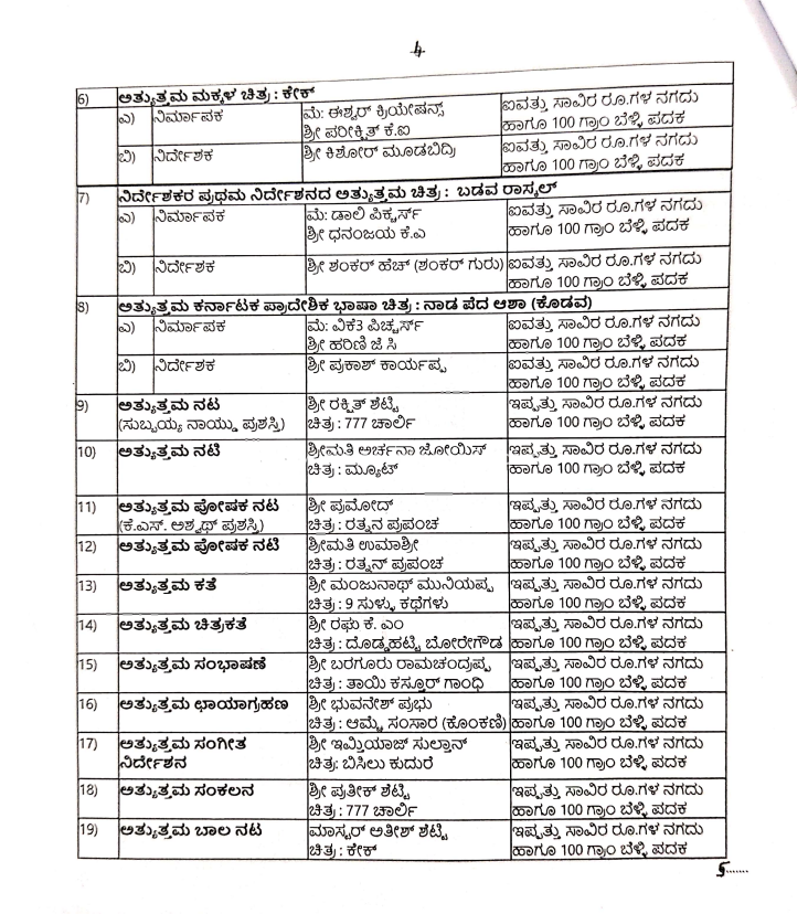 ನಿರ್ಮಾಪಕ : ವಿಜಯ್ ಕಿರಂಗದೂರು: ನಿರ್ದೇಶಕ ಸಂತೋಷ್ ಆನಂದ್ ರಾಮ್: ತಲಾ 50 ಸಾವಿರ ನಗದು ಮತ್ತು 100 ಗ್ರಾಮ್ ಬೆಳ್ಳಿಯ ಪದಕ